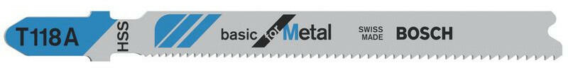 Fémlemezek vágása - A T 118 A Basic for Metal szúrófűrészlap fémek egyenes vágására alkalmasHullámvonalban álló mart fogazata ideális különleges előírások nélküli vágásokhozA teljesen átedzett, kiváló minőségű gyorsacél fűrészlap anyaga normál szilárdságú, perforálatlan fémlemezek vágására alkalmasEmellett a fűrészlap nagyon sűrű (1,1–1,5 mm), progresszív fogosztása lehetővé teszi nagyon vékony, 1–3 mm vastagságú tömör fémlemezek vágásátT-Shank befogószáras rögzítő rendszerrel rendelkező szúrófűrészekhez használhatóMinden T befogószárú szúrófűrészhez használható