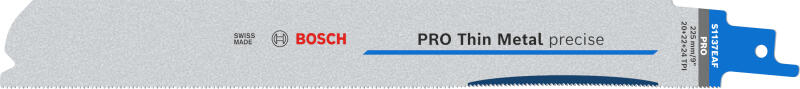 PRO Thin Metal precise S1137EAF fémcsövek és -profilok pontos vágásához hosszú élettartammal A fémmegmunkálóknak, felújítóknak és villanyszerelőknek rendszeresen kell fémcsöveket és más acélszerelvényeket vágniuk a szablyafűrésszel. A PRO Thin Metal precise S1137EAF kifejezetten az ilyen feladatokra készült. A hosszú élettartamot és tiszta vágást egyaránt kínáló PRO Thin Metal precise S1137EAF egy fejlett bimetál szablyafűrészlap, az ívelt fogakat kiemelő HSS csíkkal. A vastag szénacél testtel kiegészülve ez egy nagyszerű fűrészlap, ha vékony fém minőségi, pontos vágása a cél.