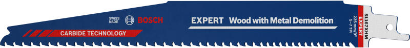 Fába beágyazott fém vágása hosszú élettartammal - A legnehezebb bontási munkákhoz a Bosch kifejlesztette az EXPERT 'Wood with Metal Demolition' fűrészlapot. A progresszív fogosztás jóvoltából nem lepődik meg az anyagvastagság változásától; az egyedileg megerősített fogvállak ellenállnak a fába ágyazott nagyszilárdságú acél okozta legkellemetlenebb ütéseknek; és mindezt kiegészíti a keményfém azon képessége, hogy bármit átszakít, ami az útjába kerül. Minden S befogószárú szablyafűrészhez használható